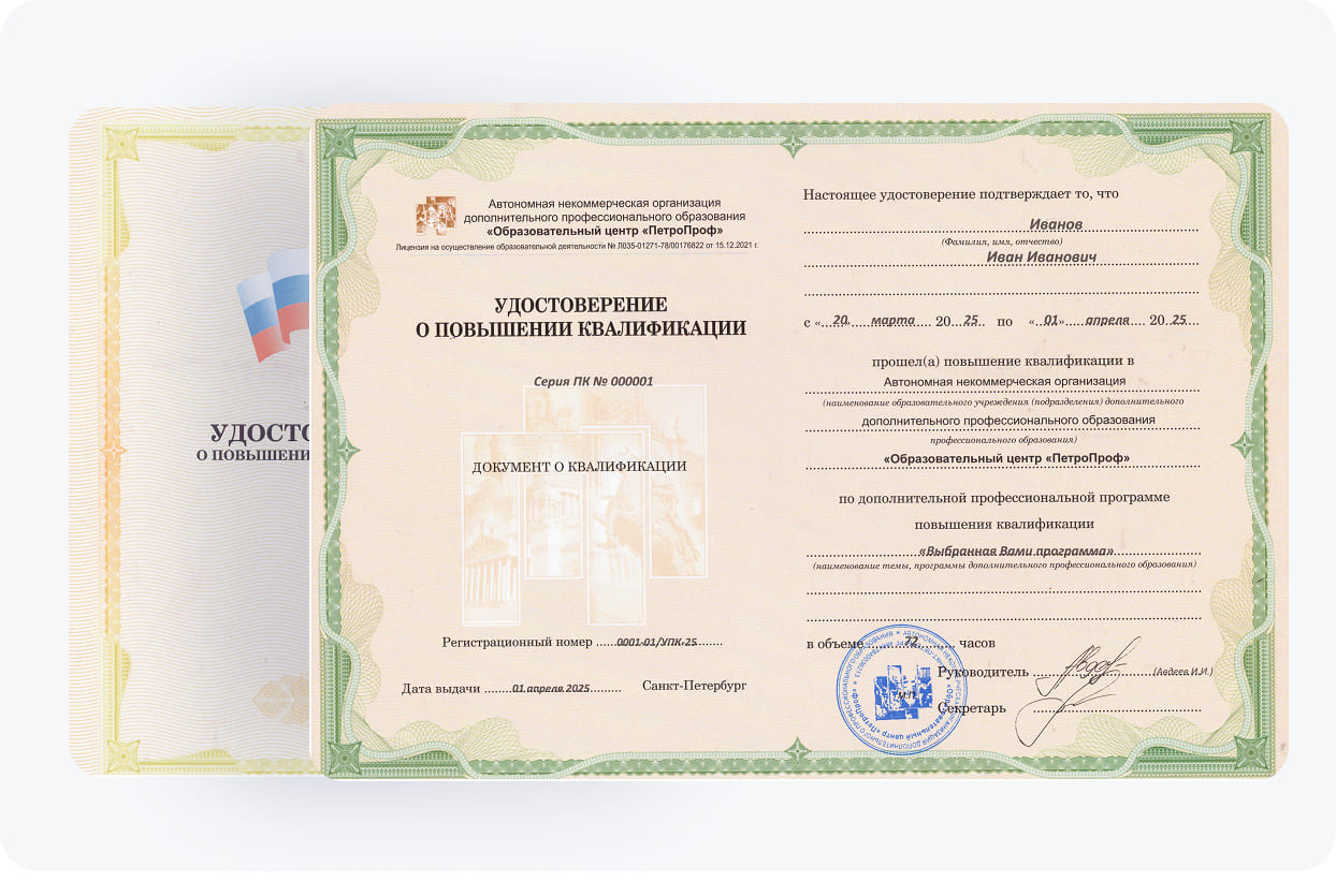 Наши программы повышения квалификации полностью соответствуют установленным стандартам и требованиям. Они отличаются высоким качеством, структурированным материалом, эффективностью и большим перечнем полезных тем. Студентам удастся освоить теоретические и практические блоки быстро и на комфортных условиях. Тем более, что преподаватели "ПетроПроф" не только передадут свои знания и навыки, но и помогут разобраться с трудными моментами.